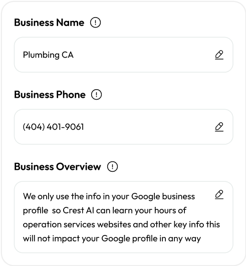 We only use the info in your Google business profile so Crest AI can learn your hours of operation services websites and other key info this will not impact your Google profile in any way